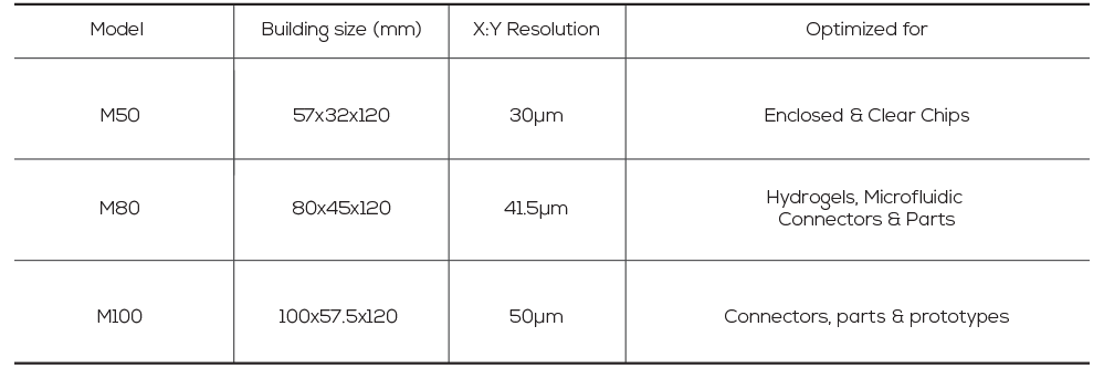 All CADworks3D Microfluidics Printers come with a variable Z axis ranging from 5µm to 200µm. All models are fully open-source